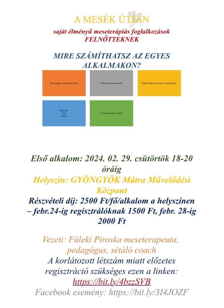 A két hetenként egymást követő alkalmakon egy-egy népmese meghallgatása kapcsán megkeressük, hogy a mai világban, a mi felnőtt életünkben mit mondhat, mit adhat egy mese. Ráhangolódással, érzékszervi belemerítkezéssel, beszélgetéssel keressük a kapcsolódásainkat. Maximum létszám 12 fő. Az alkalmak külön-külön is látogathatóak.